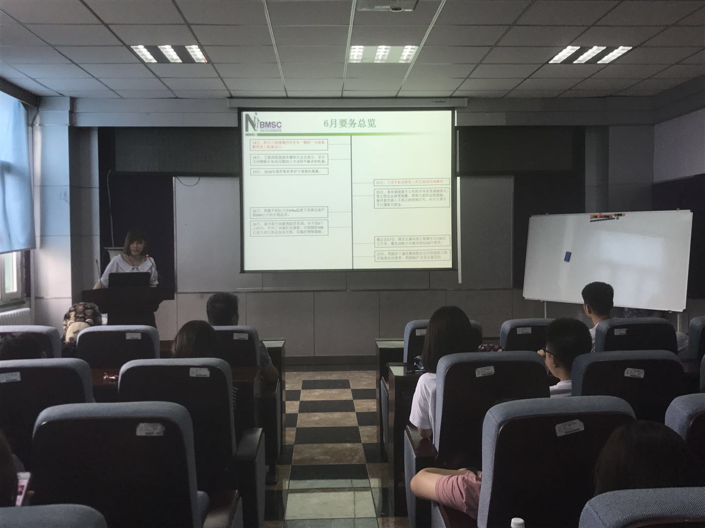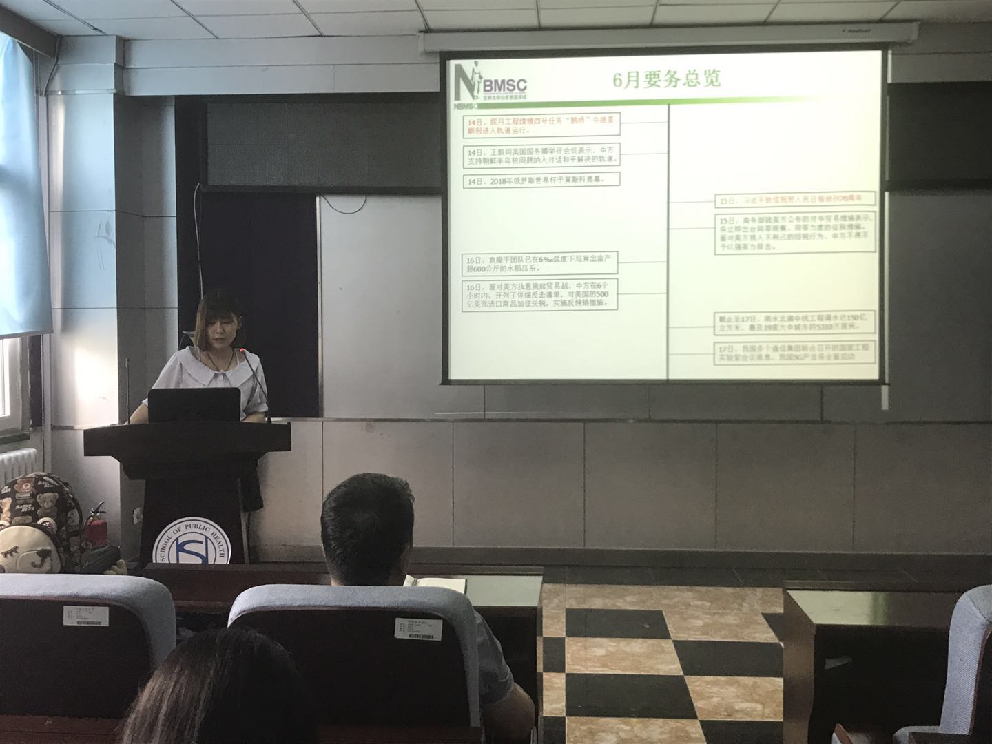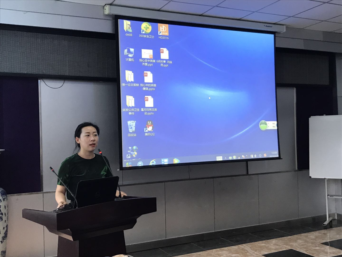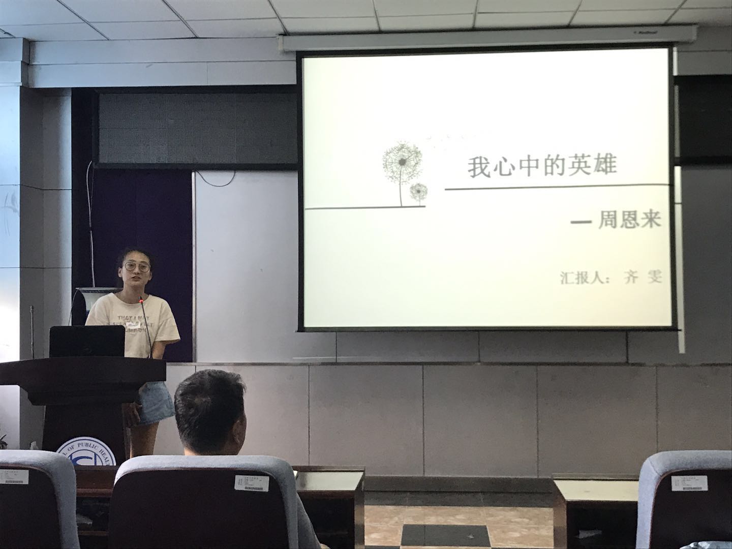每个人的心中都有一个英雄,这个英雄是我们的榜样,值得我们去学习他身上的高尚品质。齐雯同学说她心中的英雄是周恩来,希望同学们可以学习他勤勤恳恳,任劳任怨,“鞠躬尽瘁,死而后已”的全心全意为人民服务的精神;严于律己,无私无我的奉献精神;在科研道路上求真务实,脚踏实地。紧接着,康琪同学讲述了狼牙山五壮士的故事,马宝玉、胡德林、宋学义、葛振林和胡福才五位英雄为掩护群众和部队撤退,毅然地把敌人引上了狼牙山棋盘陀峰顶绝路,为了不让敌人发现自己的部队,跳崖身亡,用生命和鲜血谱写出了一首气吞山河的壮丽诗篇,希望同学们以这种精神为动力,勤奋学习,刻苦钻研。随后,扈月阳同学谈到邓稼先是自己心中的英雄,为了祖国的强盛,为了国防科研事业的发展,他甘当无名英雄,默默无闻地奋斗了数十年。他常常在关键时刻,不顾个人安危,出现在最危险的岗位上,充分体现了他崇高无私的奉献精神。最后,刘丝雨同学总结了6月份的时事新闻,让同学们更多地了解国内外发生的事件,更加客观地认识新闻事件。