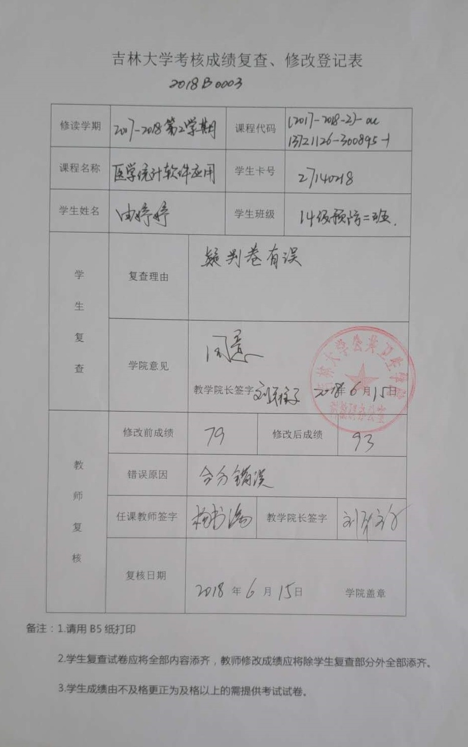 学院2014级由婷婷同学(27140218)2017-2018-2《医学统计软件应用》成绩更正如下: