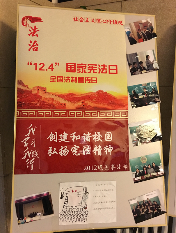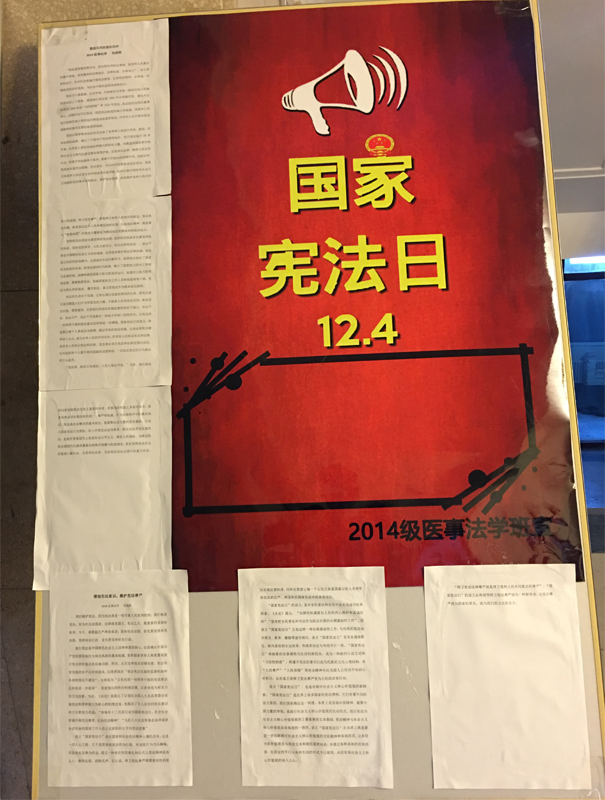 医事法学教研室组织2012级、2013级、2014级医事法学专业学生和医事法学专业硕士研究生,制作了“宪法宣传日展板”,传递依宪治国、依宪执政理念,弘扬宪法精神。