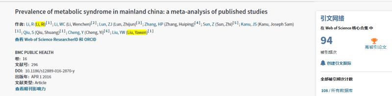 刘雅文教授团队于2016年4月发表在《BMC Public Health》的论文“Prevalence of metabolic syndrome in mainland china: a meta-analysis of published studies”入选社会科学总论的top papers(本学科被引前1%的论文),被引80次,占社会科学总论论文总被引的5%,单篇被引排名第一。 刘雅文教授科研团队在慢性病防控方向经过多年的深入研究已形成一批高质量的学术成果。 该文章入选ESI top papers标志着成果已经引起了国际同行的关注和认可,形成了一定的国际学术影响力,对于我校公共卫生学科建设起到了推动作用。