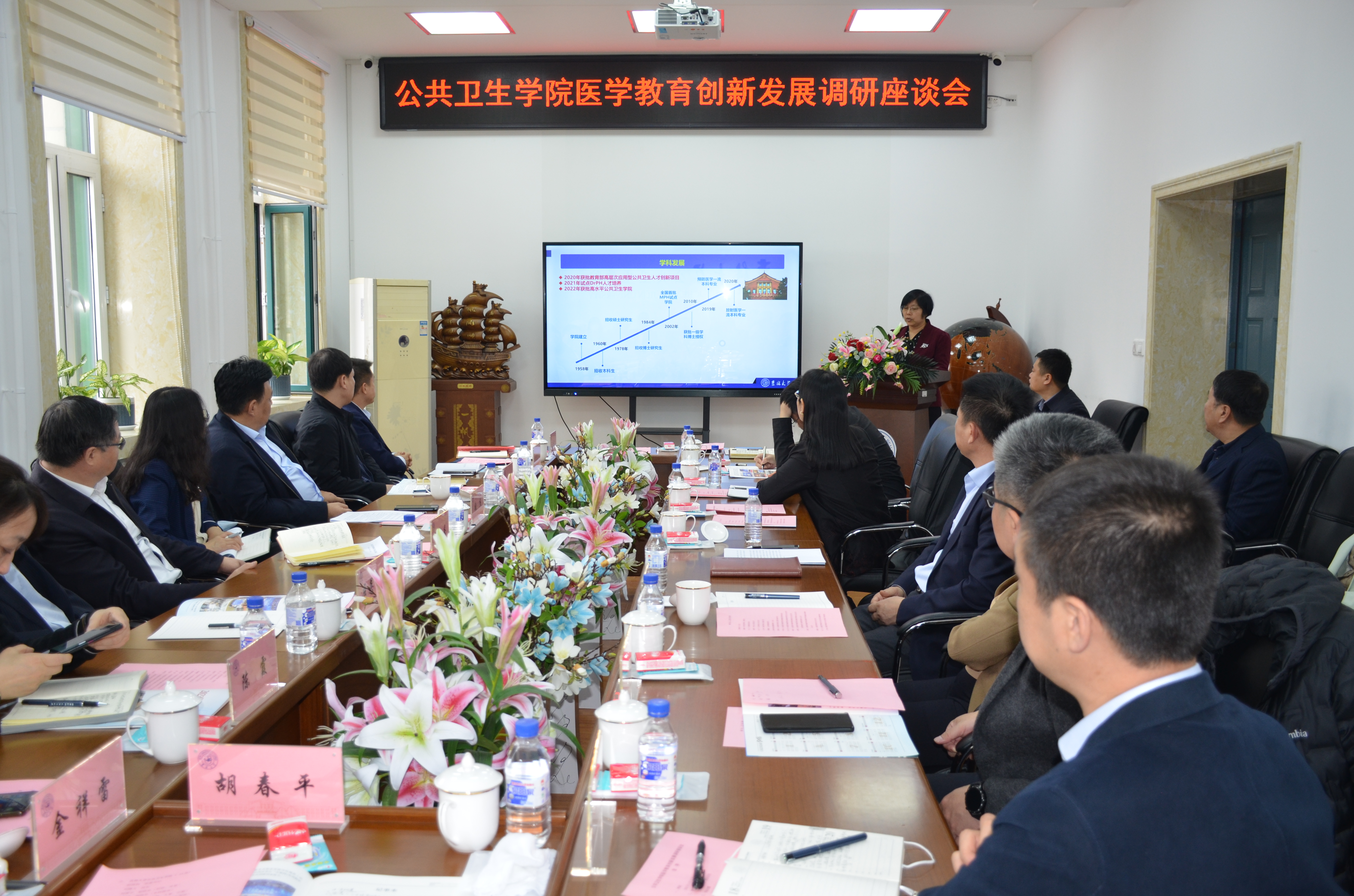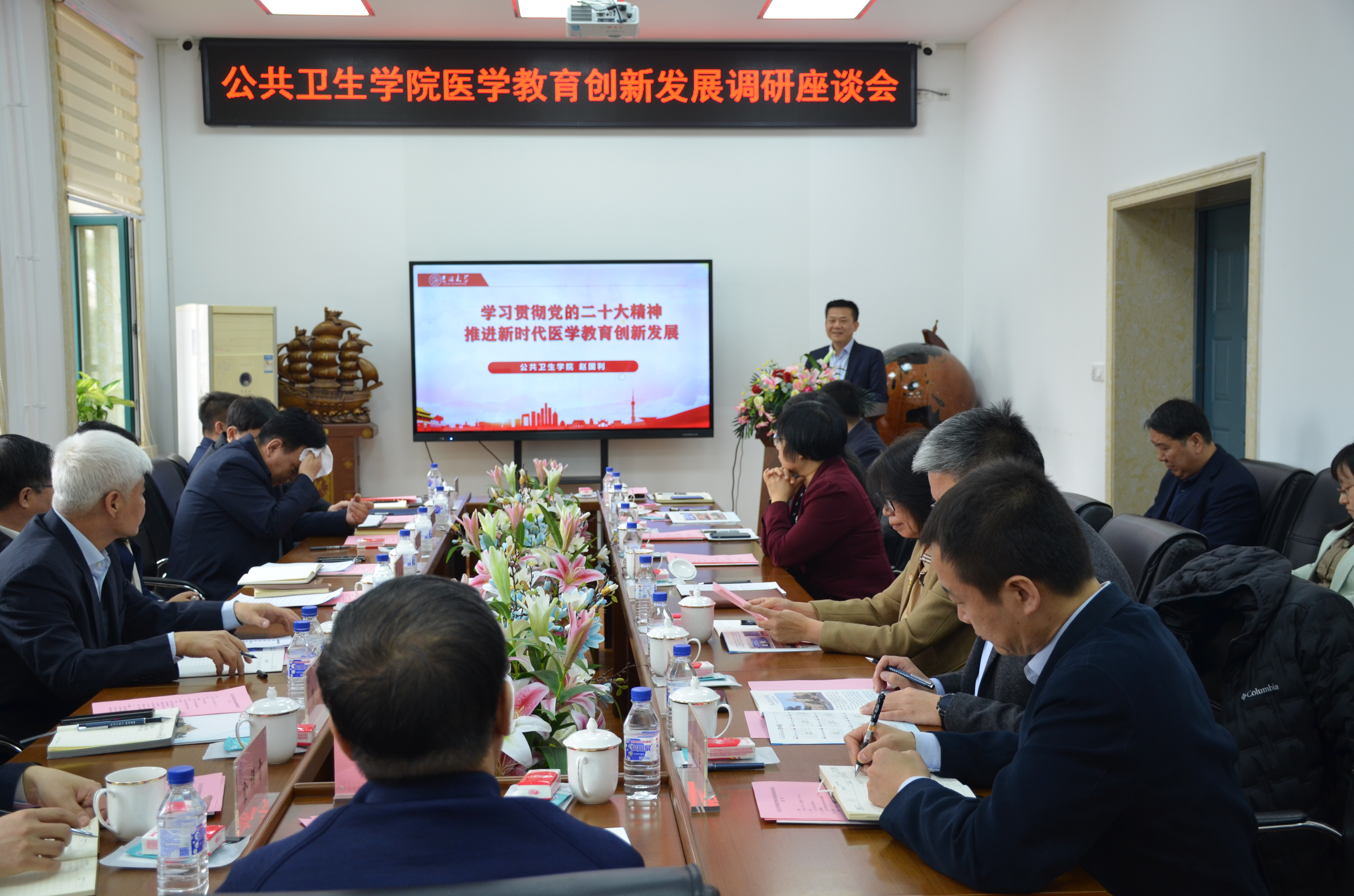 党委委员、班子成员、学位评定委员会主席、学术委员会主任、教学委员会主任、各系主任和机关部分科室主任参加调研座谈。座谈会由白求恩医学部党工委常务副书记屈英和主持。
