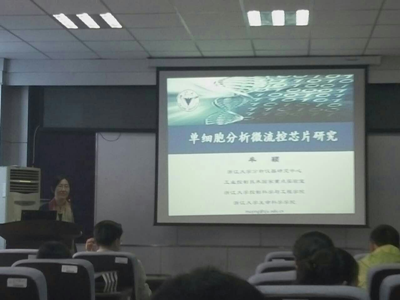 报告厅举办。会上由浙江大学牟颖教授主讲,介绍了具有自主知识产权、操作简便等优势的自吸分液式微流控芯片的相关研究,以及基于此芯片的数字PCR技术所具有的广泛的应用前景。会上同学认真学习相关技术知识,讨论积极。