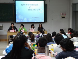 07级朱晓燕、李丽、伍翔群和赵娜四位成功保研或考研的优秀学生,与同学们共同交流考研保研经验。