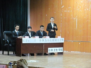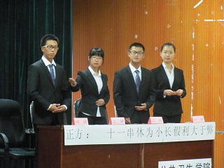 主持人宣布开始后,由双方辩友分别自我介绍,并简单展示本方观点;之后,有请评委上场。主持人宣布比赛规则和评分标准。紧张热烈的比赛随即开始,本场比赛共四个环节。在整场辩论过程当中,XDXX