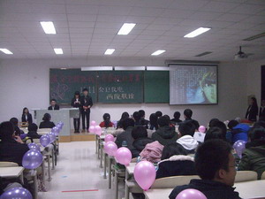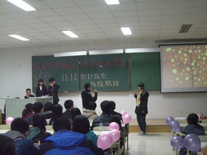 在两院团委学生会的精心准备后,联谊晚会拉开帷幕。晚会以点取同学手中号码的形式进行幸运抽奖和游戏比赛。首先是持有特殊号码的同学画一幅自画像,然后进入第一个游戏“我划你猜”。参与游戏的同学笑料百出,当然也出现猜题高手。接下来进行了“听音猜歌”,游戏者根据歌曲前奏猜出该首歌并进行演唱,这一环节出现了麦霸,也将全场气氛引入高潮。比分落后者也有残酷的惩罚——胜者配制的饮料。之后的游戏环节是为视频配音,齐心协力过难关。最后一个游戏,当男生背起女生的时候,全场进入了另外一个高潮。联谊在一片笑声中完满结束。
