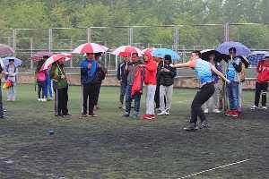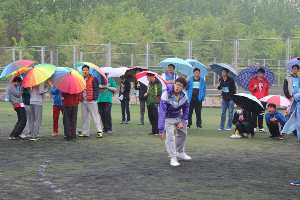 本场比赛运动员分为两组,上午9时30分,参加男子学生组胶球掷远决赛的运动员前往检录处检录,之后统一在工作人员的安排下带到比赛场地等待上场。尽管天气阴冷且小雨霖霖,XDXX