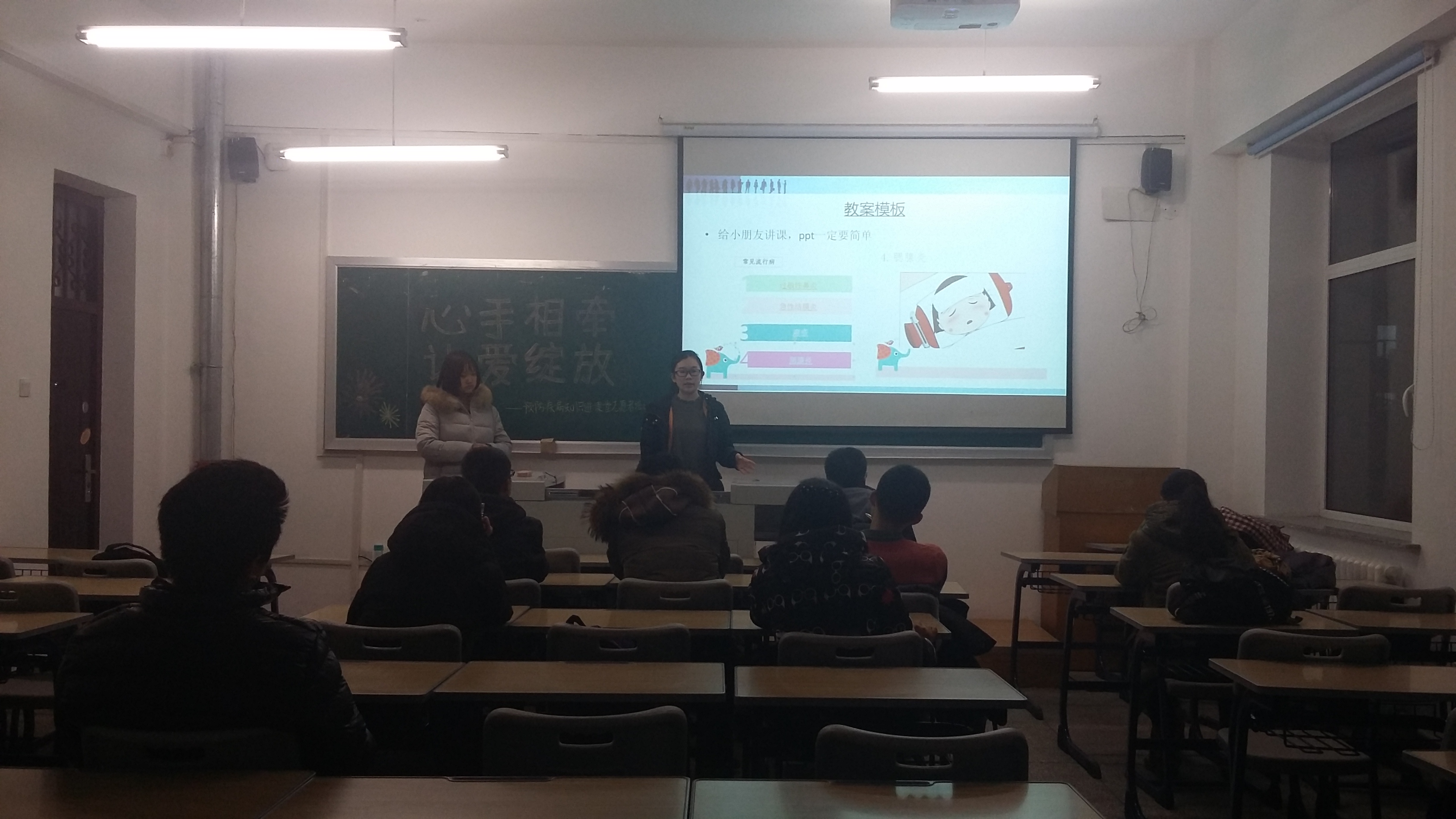 会上,志工部的部员助理为大家介绍了此次志愿服务的基本流程,让同学们对活动内容有了初步了解。随后,2015级部员从自身志愿服务经历出发,向同学们传授了“预防知识进课堂”志愿服务的经验,并强调了授课中语速、用词、语言风格等方面的注意事项。例如,考虑到小朋友的特点,授课素材的选取、模板的形式都不能太过严肃,而应迎合孩子的兴趣,可以灵活运用图片与动漫,以达到寓教于乐的目的。培训的过程中,志愿者们在学习经验的同时,也清楚地认识到,端正的服务态度和适宜的服务方法同样重要。