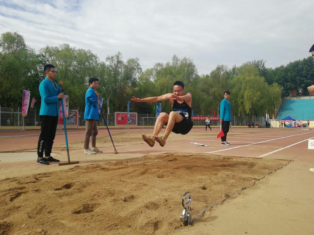 王兆丰同学上场时,精神饱满,十分自信。比赛开始,只见他逐渐加快助跑速度,在跳跃线上纵身一跃,腾空时双臂用力后摆,收腹举腿,动作十分标准,以完美的姿势落入沙地,取得了5.7米的好成绩。出于自信及保存体力的原因,王兆丰放弃了初赛起跳三次择优录入成绩的权利,并凭借一次成绩顺利进入决赛。决赛第一跳,由于起跳时的微小失误,王兆丰同学并没有发挥出正常水平。而在第二跳,因部分沙地坚硬等原因,王兆丰在下落时不慎扭到了脚踝,所以没能进行第三跳。尽管如此,王兆丰同学依旧凭借5.7米的优异成绩在参赛运动员中脱颖而出,获得了跳远比赛的最终胜利,为XDXX