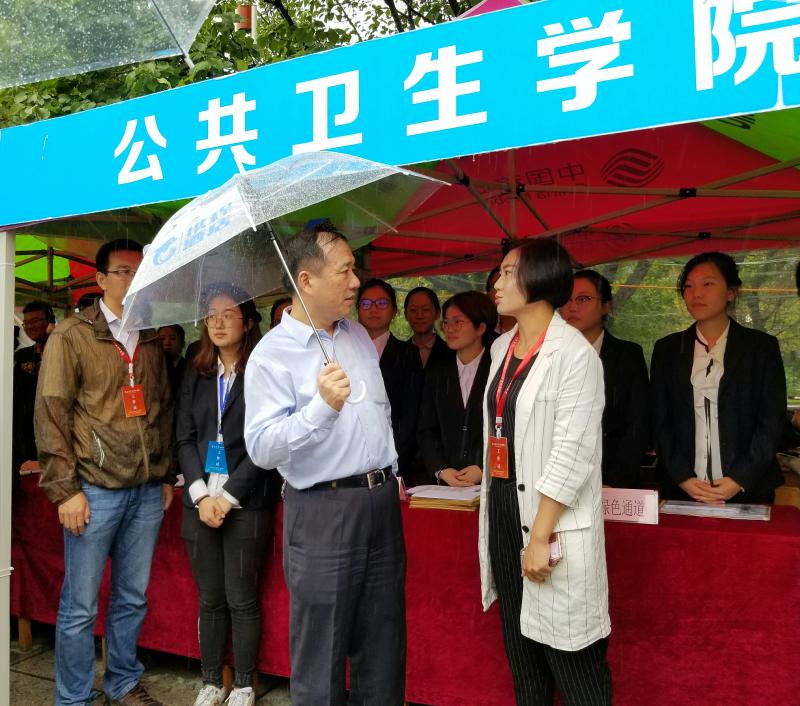 下午四时,绵绵细雨不断,党委书记杨振斌冒雨来到迎新工作现场,向XDXX