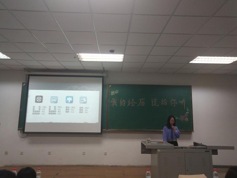 首先,霍睿老师向在场的同学们简单介绍了2014级优秀学生代表的基本情况,并向她们的到来表示热烈的欢迎。随后,2014级优秀学生代表们依次上台向同学们介绍和分享自己的研究生推免经验,有的谈到了如何参加拟报考学校的夏令营获得推免资格;有的谈到了如何联系到适合自己研究方向的导师;有的谈到了具体的复习和考试经验。与此同时,她们都强调了平时认真学习和积累知识的重要性,鼓励同学们制定科学的复习计划,形成自己的知识框架,有条不紊地学习。从她们精心准备的幻灯片和现场认真恳切的言辞中,在场的同学们不仅获得了宝贵的学习经验,还端正了自己学习的态度,明确了学习方法。