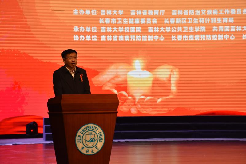 随后,主持人盛情邀请吉林省副省长安立佳上台致辞。他在讲话中提到,艾滋病虽可怕,但艾滋病人并不可怕,希望大家能减少心中对艾滋病患者的芥蒂,和艾滋病患者携手,一起与艾滋病对抗到底。他的讲话深入人心,让同学们切身体会到艾滋病患者的不易,同时也更加了解艾滋病防治的重要性。