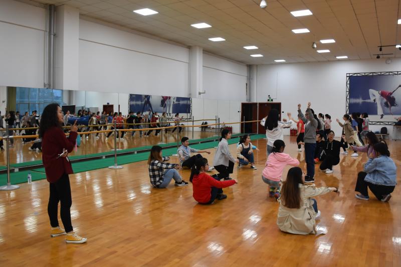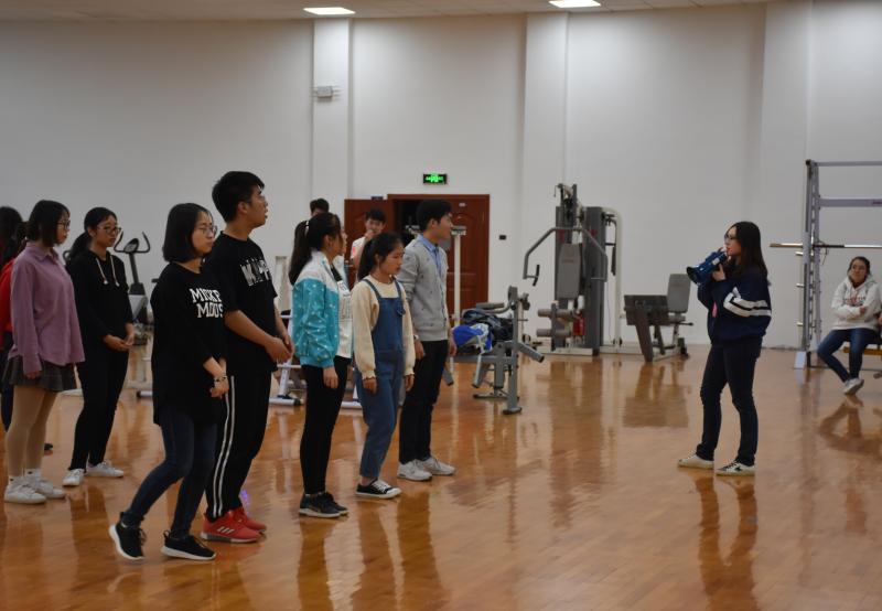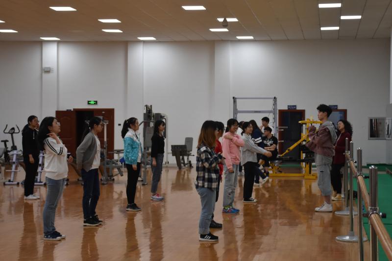 新民校区体育馆健美操室进行广播操、啦啦操集训。
