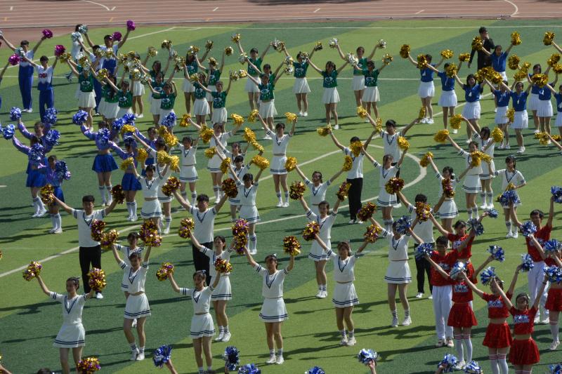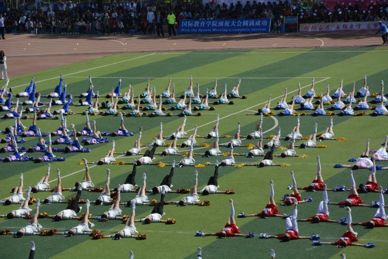 第58届运动会开幕式在中心校区体育场隆重举行。8点30分左右,各学院广播体操、啦啦操表演队伍上场,她们舞动花球,迎风奔跑,形成了一条七彩波浪。