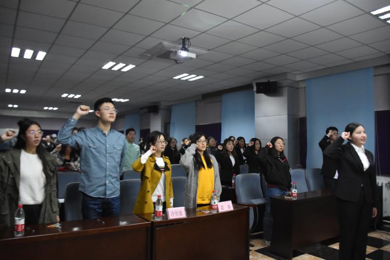 最后一项是重温入团誓词,由伊再提古丽同学领誓。在领誓人的带领下,全场同学坚定地举起右手,呈握拳状贴于耳后,将入团誓词缓缓念出。在场同学既感受到党和团交付给自己的重担,又为身为一名光荣的共青团员而骄傲。