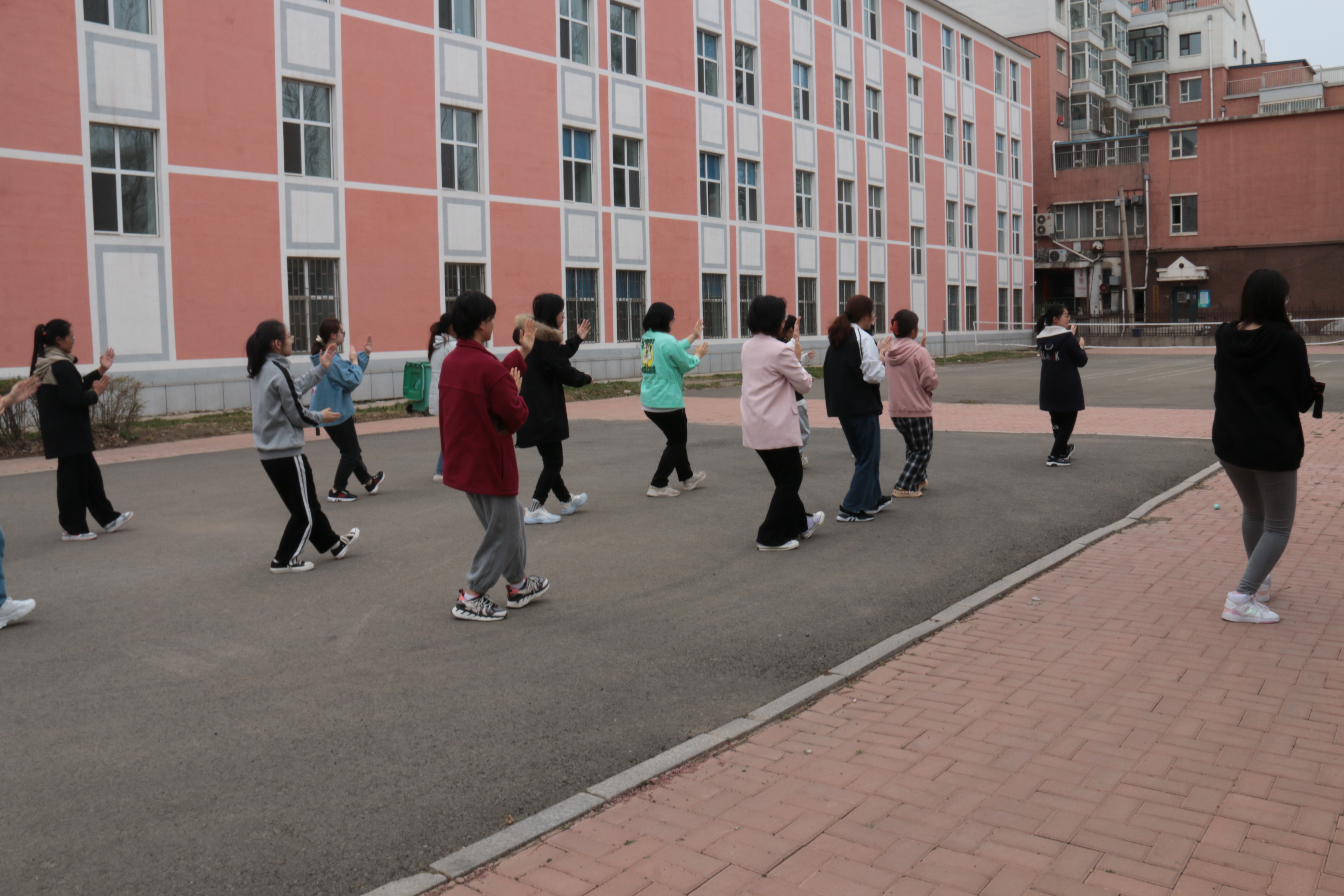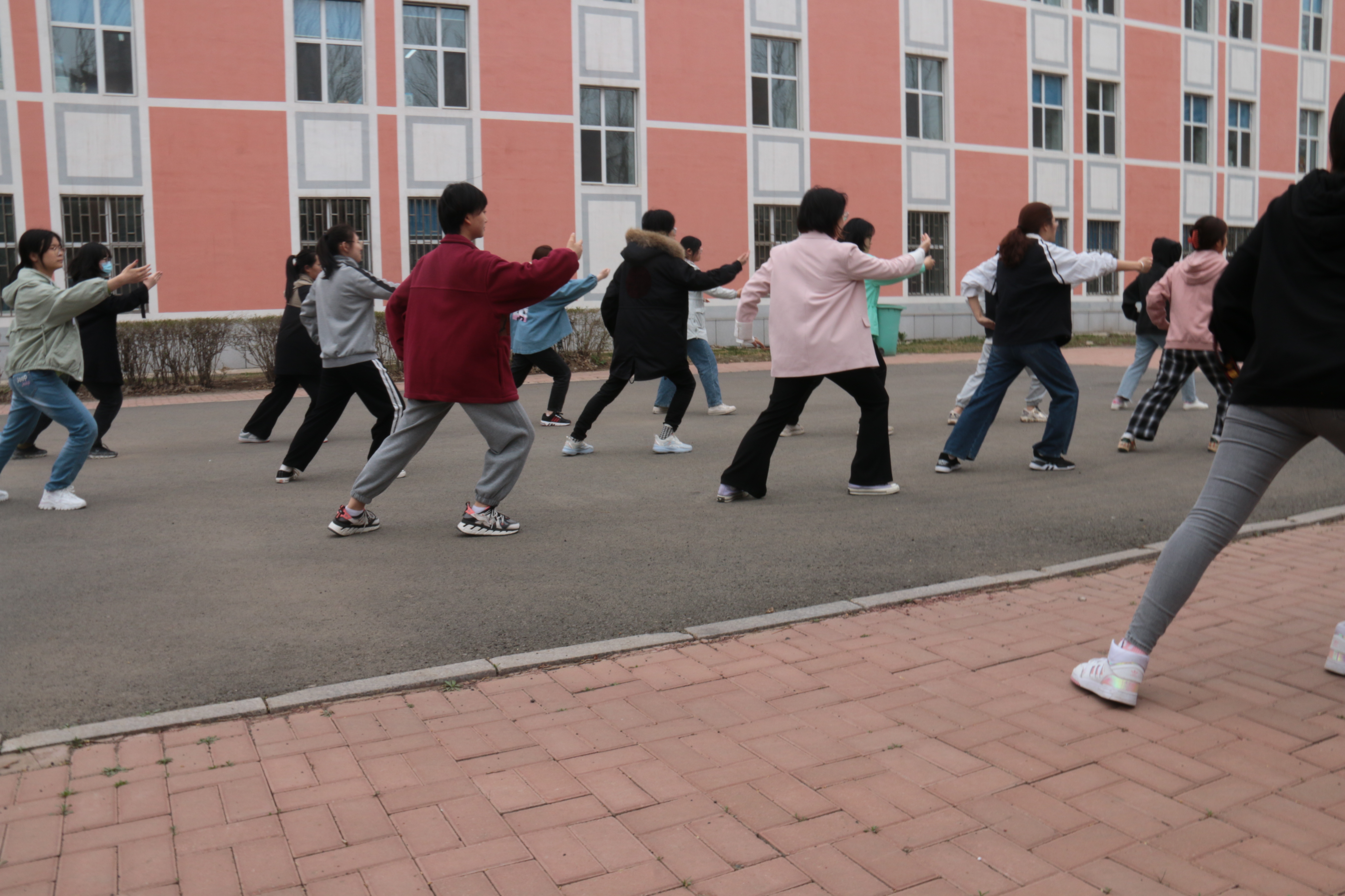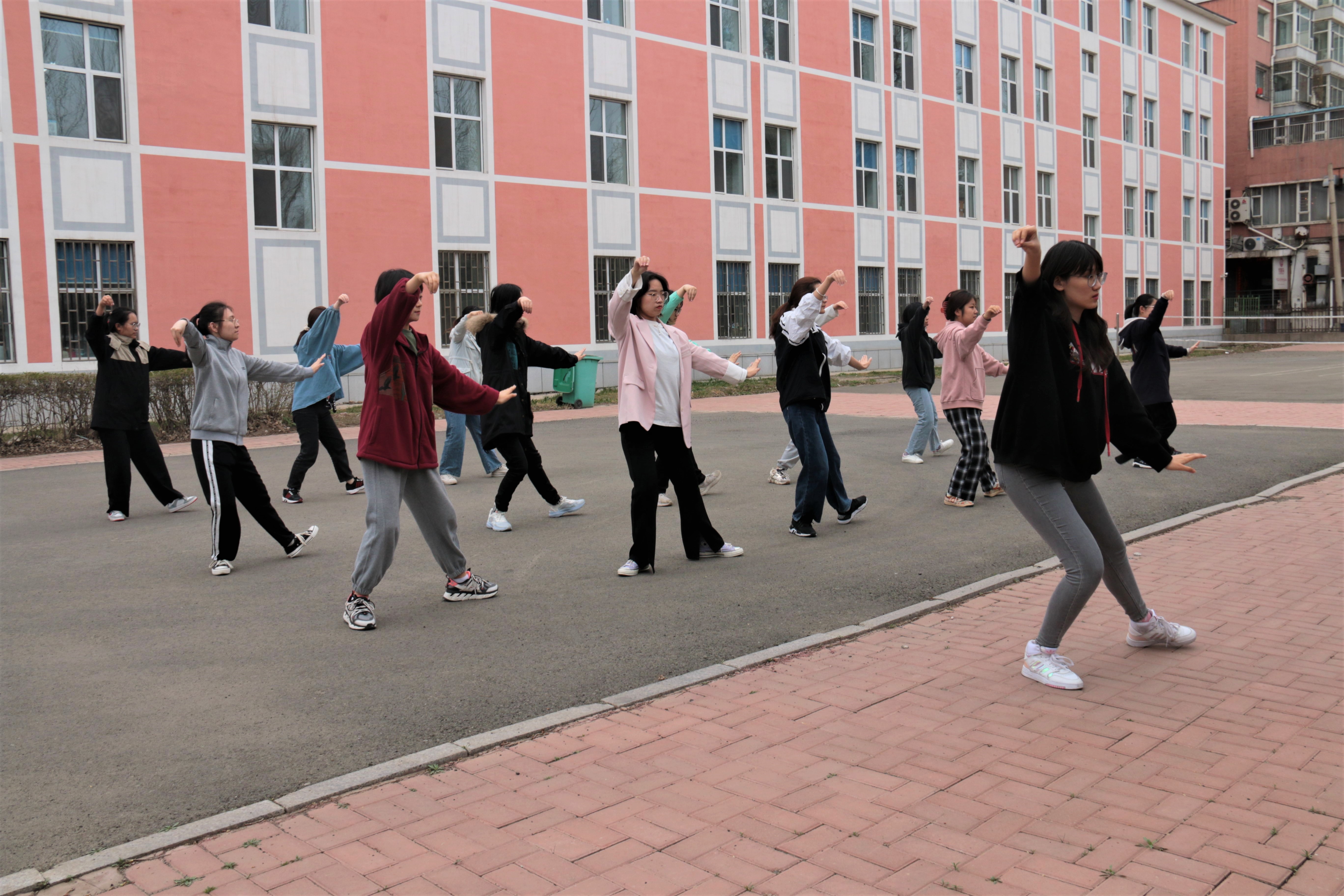 学生会带领参赛运动员们于4月22日下午在新民校区学生第九公寓后的空旷场地进行了太极拳集训。