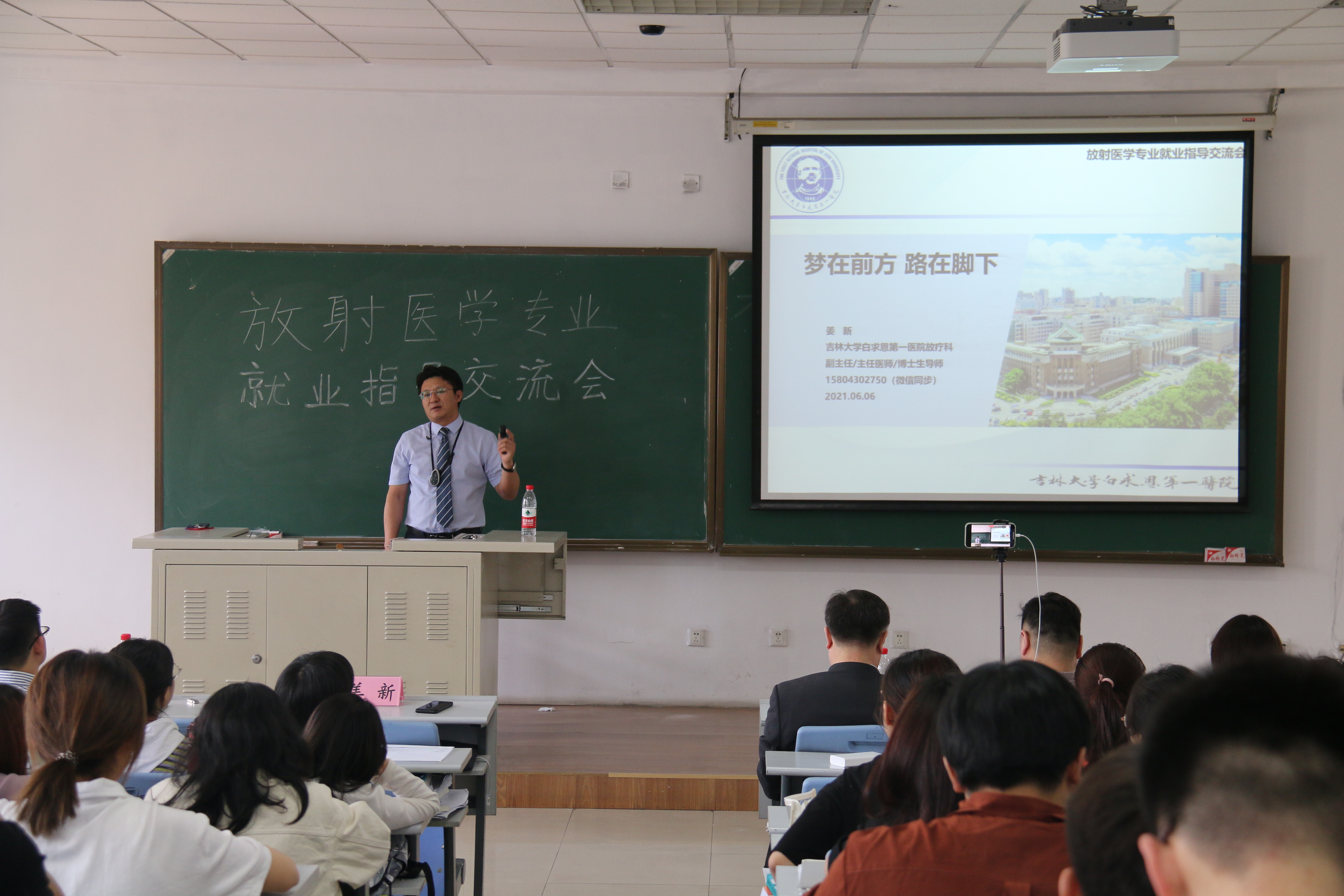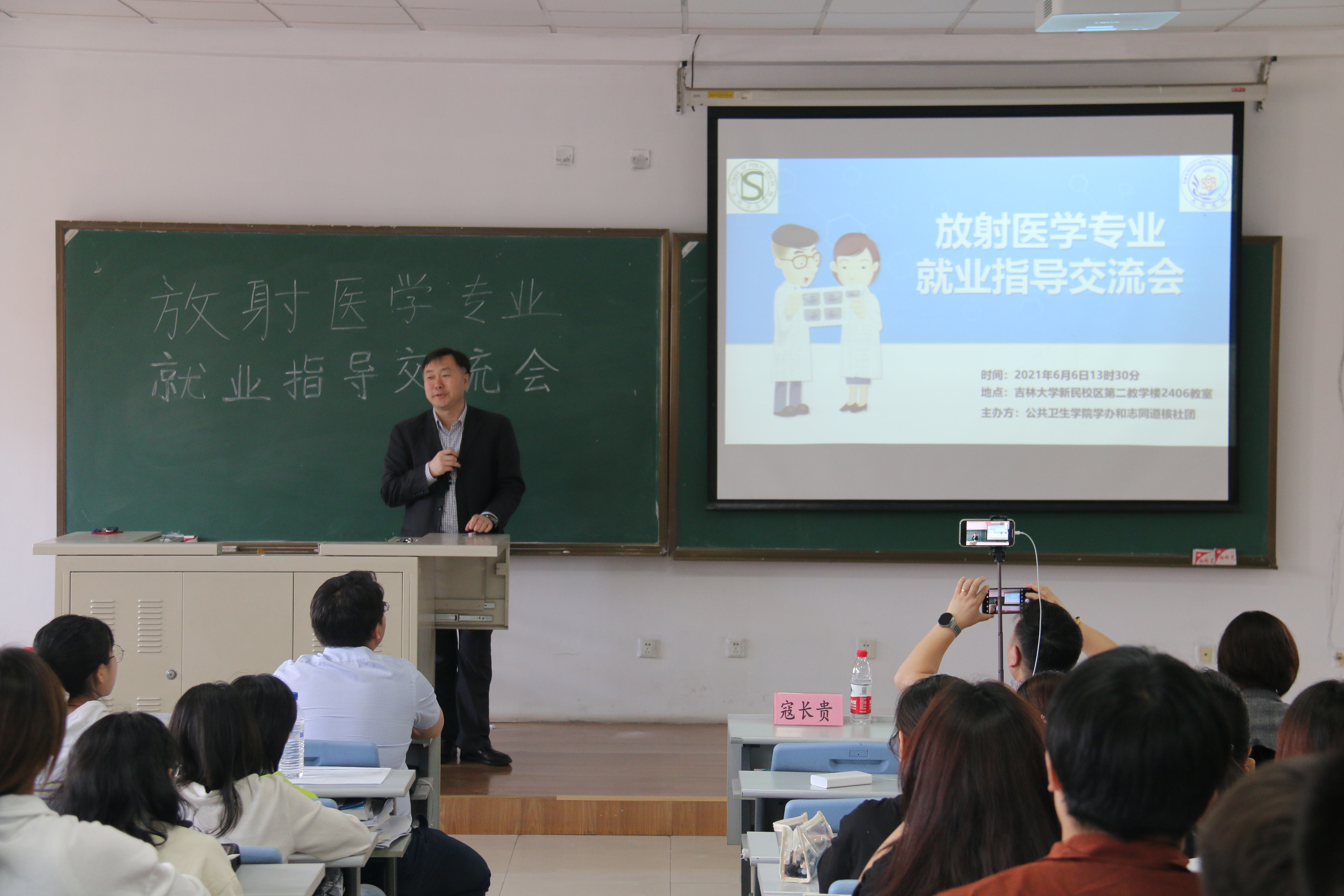 的一张名片。而后他向在场所有同学表示了美好的祝愿,希望大家都能成功考研、就业。随后,姜新、申延年、王辉东、陈滨、王志佳几位老师分别上台,就为什么要有就业指导,就业指导应该着重考虑的问题、放射医学专业未来毕业面临的方向等方面进行了详细的讲述。姜新老师强调了英语在学术交流中的重要性,希望同学们能够重视英语的口语和翻译。几位老师还着重讲述了放射医学专业考研的形势以及就业求职的方向和注意事项,并指导大家正确认识自己,鼓励大家选择自己热爱、适合的方向继续前行。最后,几位老师也纷纷表达了对同学们的祝愿,在同学们的掌声中,本次交流会圆满结束。