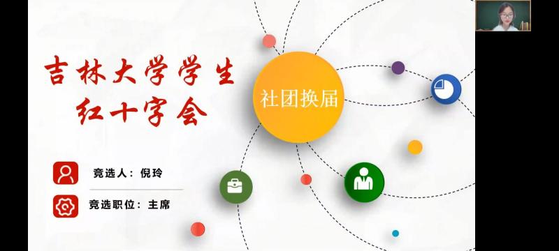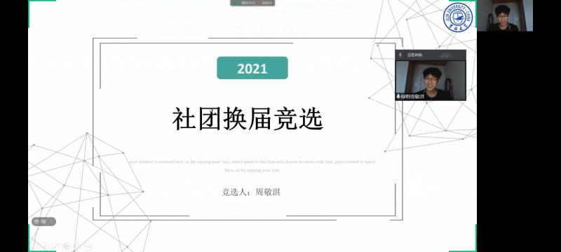 首先,由主持人宋雅萌和张晶介绍到场嘉宾并且介绍竞选规则。随后各个社团主席、队长竞选人员按照先定顺序依次打开屏幕共享配合PPT进行竞职演讲。竞选者们大多从个人简介,工作经历,个人优势和未来展望四个方面展开演讲。每位竞选者的演讲都十分精彩,他们回顾了过去一年在XDXX