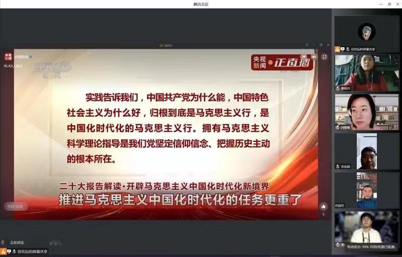 党委副书记刘金超,辅导员苏国范、冷贺璇组织全体党员、入党积极分予以及全体共青团员通过网络等途径,以支部为单位收看党的二十大闭幕式直播。